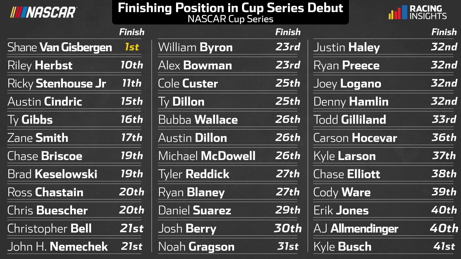 Mimo TOP30 debutovali aj Denny Hamlin, Joey Logano, Kyle Larson, Chase Elliott, Erik Jones či AJ Allmendinger. Spočítané a podčiarknuté, priemerný finiš aktuálnych jazdcov Cup Series pri debute je 26,11.