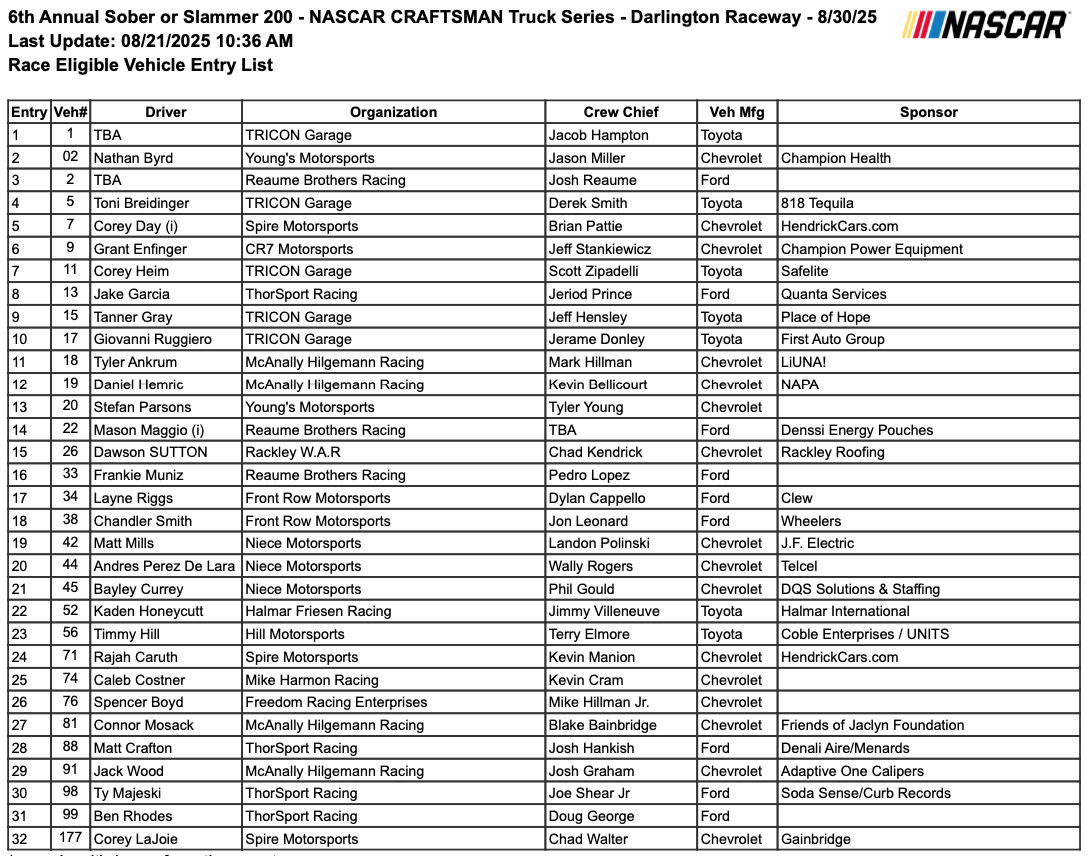 Seznam přihlášených Cup Series Seznam přihlášených Xfinity Series Seznam přihlášených Craftsman Truck Series
