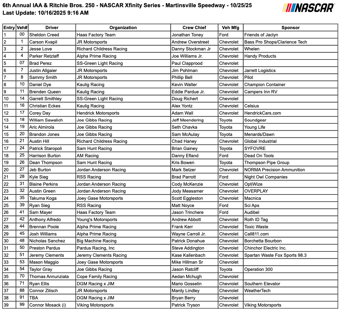 William Sawalich tento víkend nezasáhne do závodu Xfinity Series. Po tvrdé nehodě v Talladeze pociťuje příznaky otřesu mozku. Ve voze #18 ho nahradí Justin Bonsignore.
