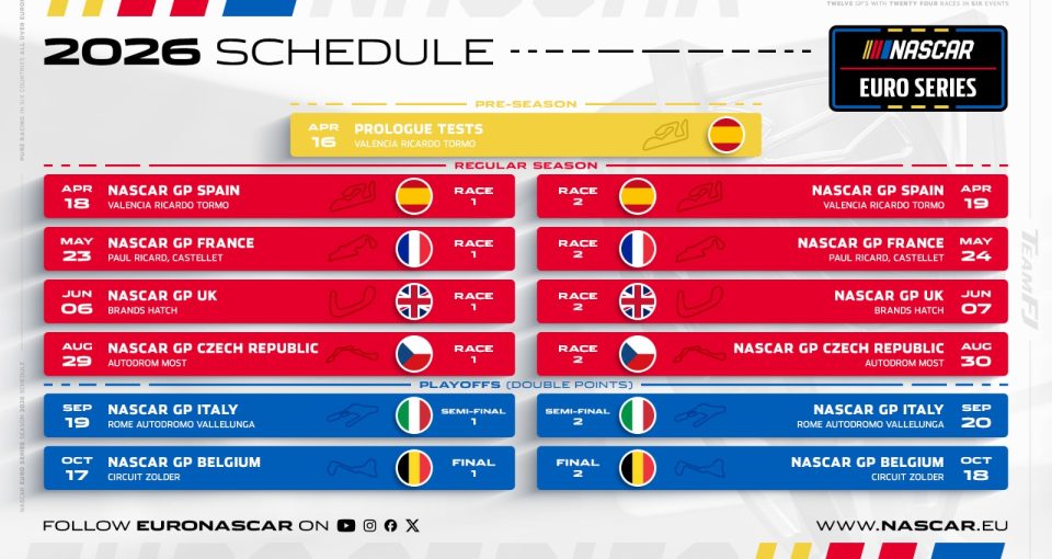 Svoji podobu kalendáře na 2026 má už i NASCAR Euro Series. Příští rok se nepodíváme na Oschersleben, naopak se pojede na jihu Francie na Paul Ricard. Vallelunga se přesouvá do Playoff.