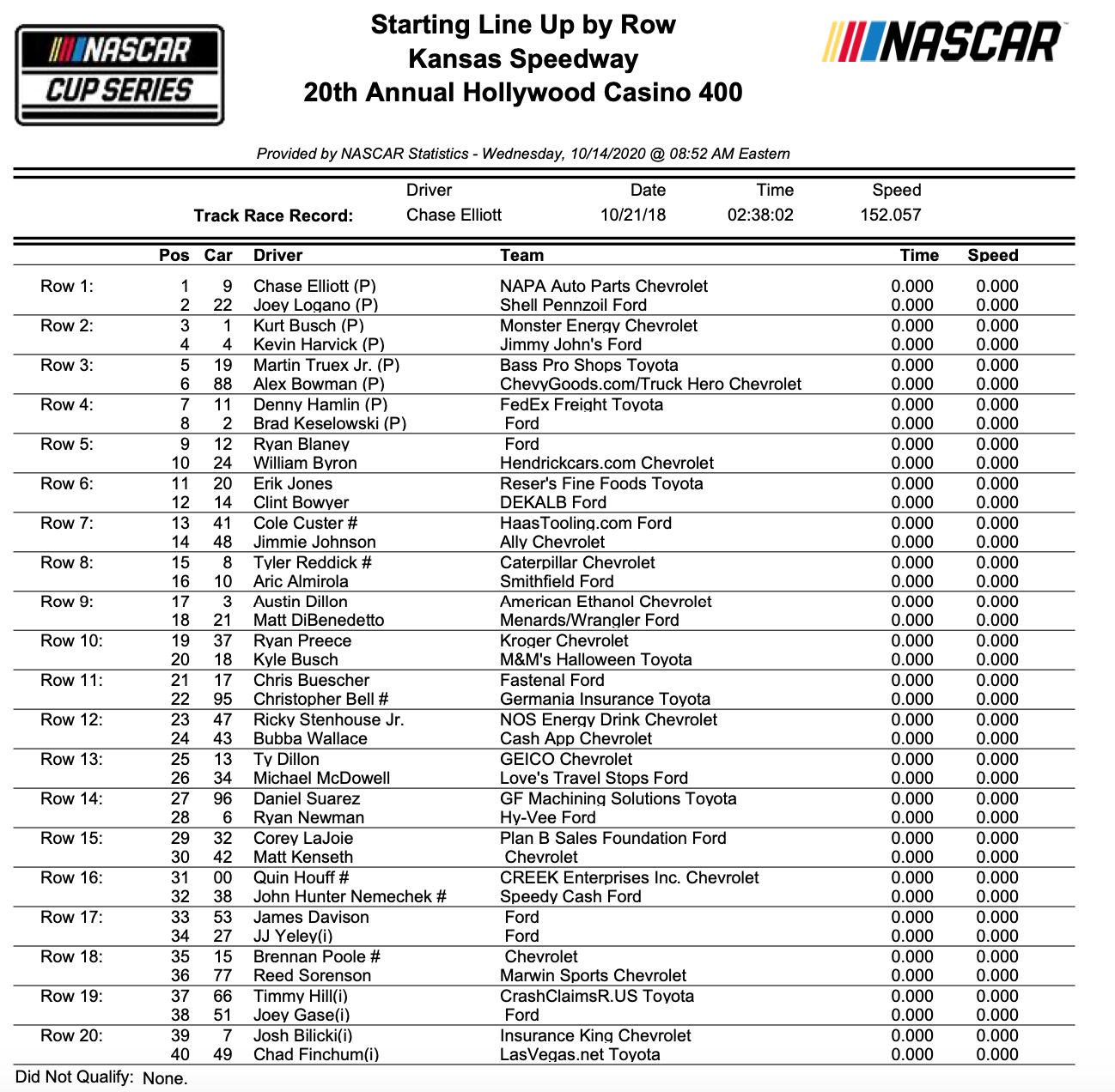 Dnes v noci se rozhodovalo o titulu šampiona ARCA Menards Series. Bret Holmes dorazil do Kansasu s dvoubodovým náskokem na Michaela Selfa. A byl to právě Bret Holmes kdo se na konci klání nejvíce radoval. Druhým místem zvětšil náskok na dvanáct bodů a ve své čtvrté sezóně se konečně dočkal. Druhé místo v konečném pořadí získal zmiňovaný Michael Self a na třetím místě skončila talentovaná závodnice Hailie Deegan. Ta dnes absolvuje svůj debut v Gander RV & Outdoors Truck Series.