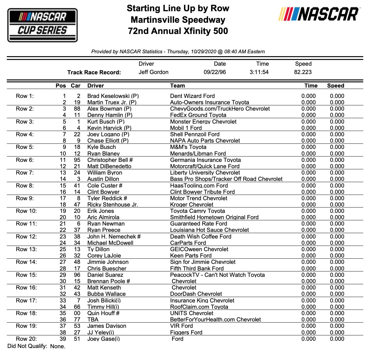 Po středečním klání bylo u mechaniků týmu #24 Williama Byrona zjištěno několik pozitivních testů na covid-19. Pro nedělní klání je připravena náhradní skupinka mechaniků od týmu JTG Daugherty, se kterým Hendrick Motorsports spolupracuje.