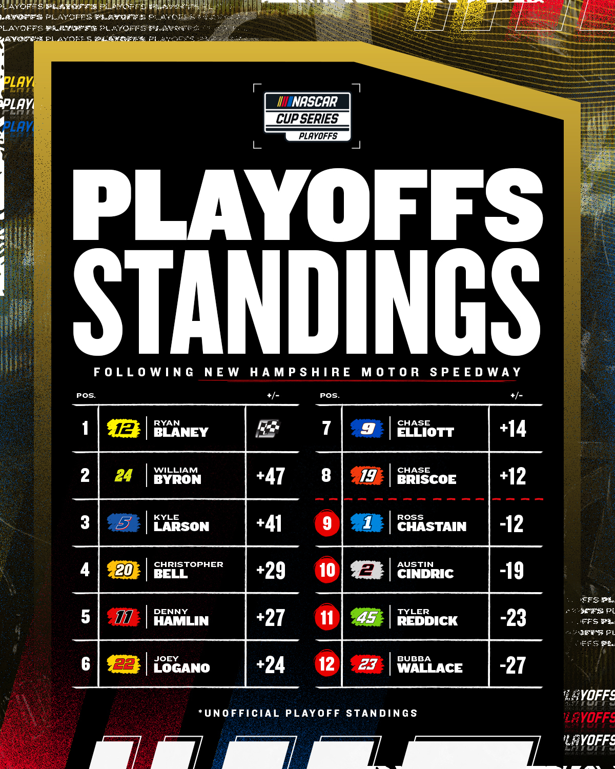 V první desítce se umístilo ještě sedm dalších kandidátů na titul. Až ve třetí desítce klání dokončili Playoff jezdci z týmu 23XI Racing – Tyler Reddick (P21), Bubba Wallace (P26).